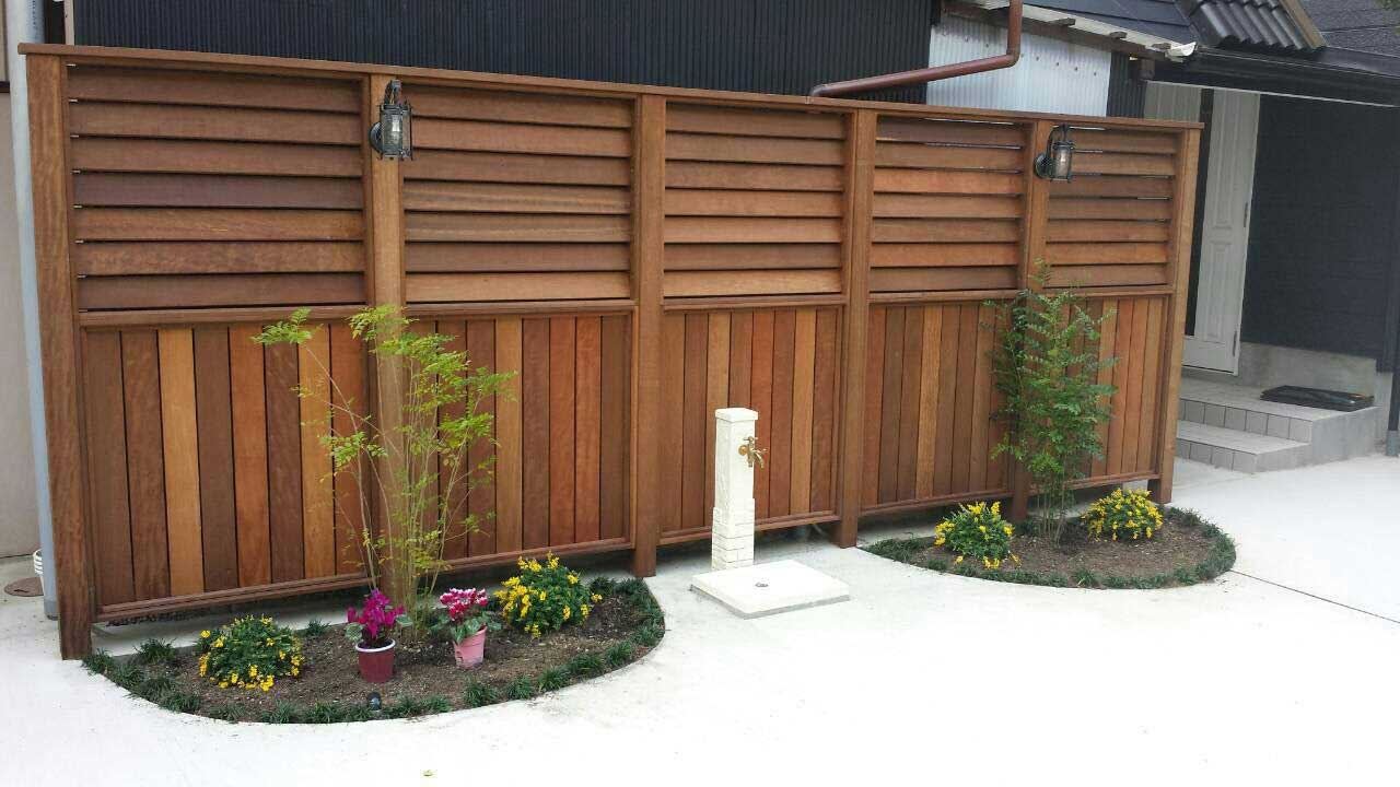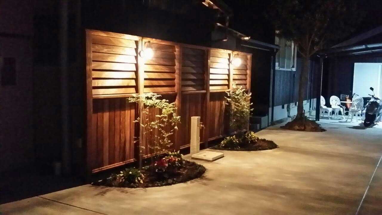車が 楽に6台は止められる駐車場‼︎ お隣の外壁がむき出しでした。 無機質だったコンクリートの駐車場にウッドフェンスで暖かみと高級感をプラス お隣様にも とても喜んで頂きました。 夜のライトアップも凄く綺麗ですね!