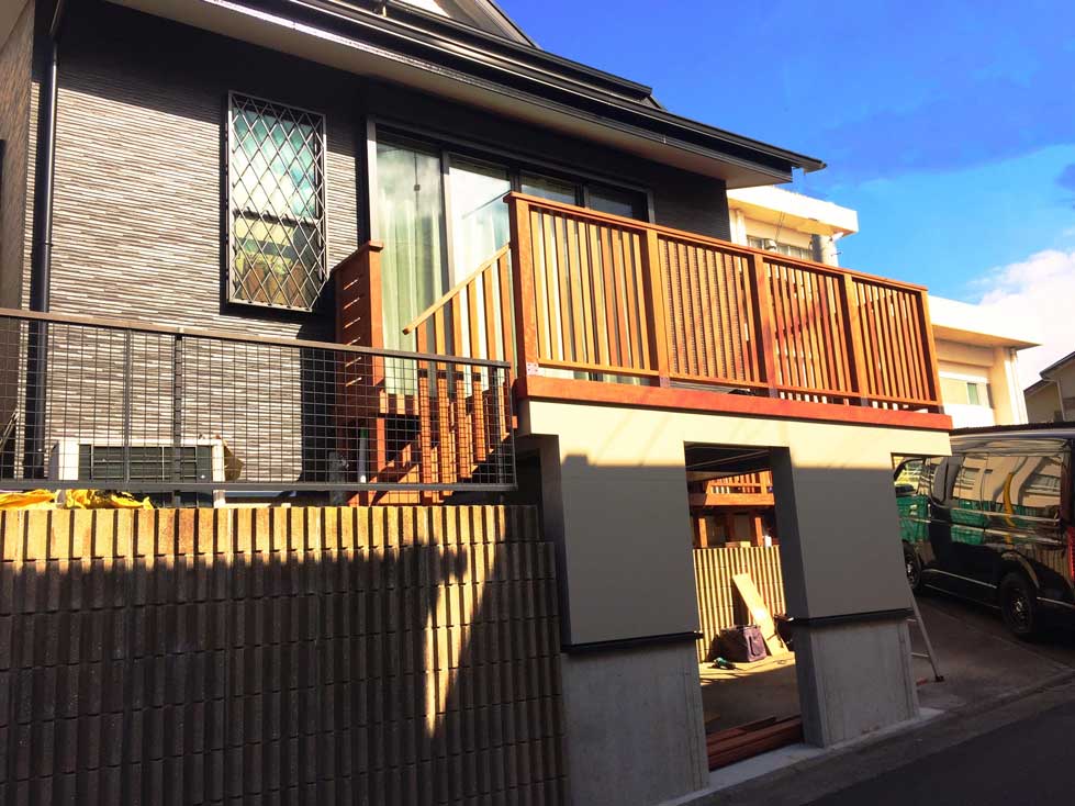 駐車場上のハイデッキ 駐車場の上も有効に使えます。 材種 イペ orマサラン 天然木は暖かみがあり天然木のぬくもりが感じられます。部屋が一部屋増えたようになりました。